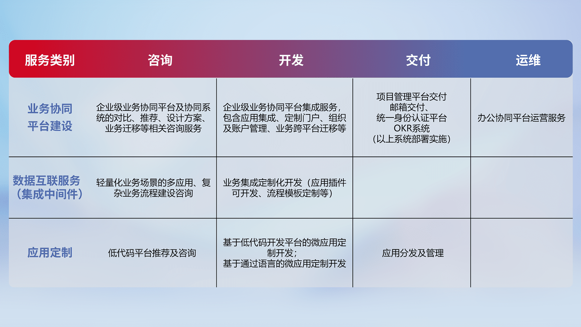 针对钉钉、、企微、、IDaas等平台级产品提供产品的规划、、、、方案、、、、交付、、、定制化开发等服务,,,实现如统一协同办公、、、、智能客户服务、、、混合会议管理、、、、智能数据查询、、、等业务场景,,实现数字化转型。。。